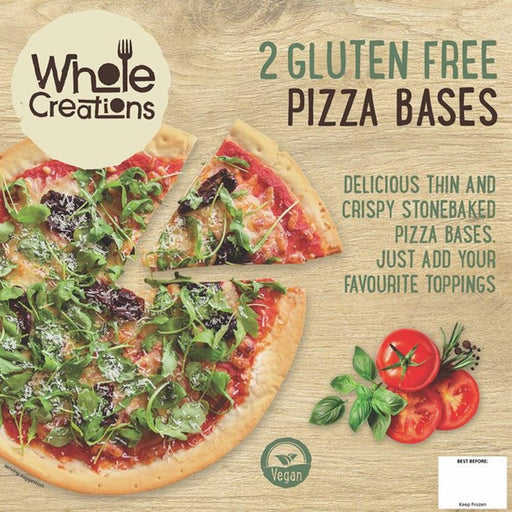 WholecreationsDelicious thin and crispy stonebaked pizza bases topped with a garlic and herb sauce and dairy free sheese.