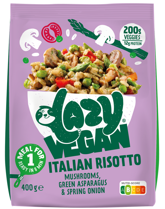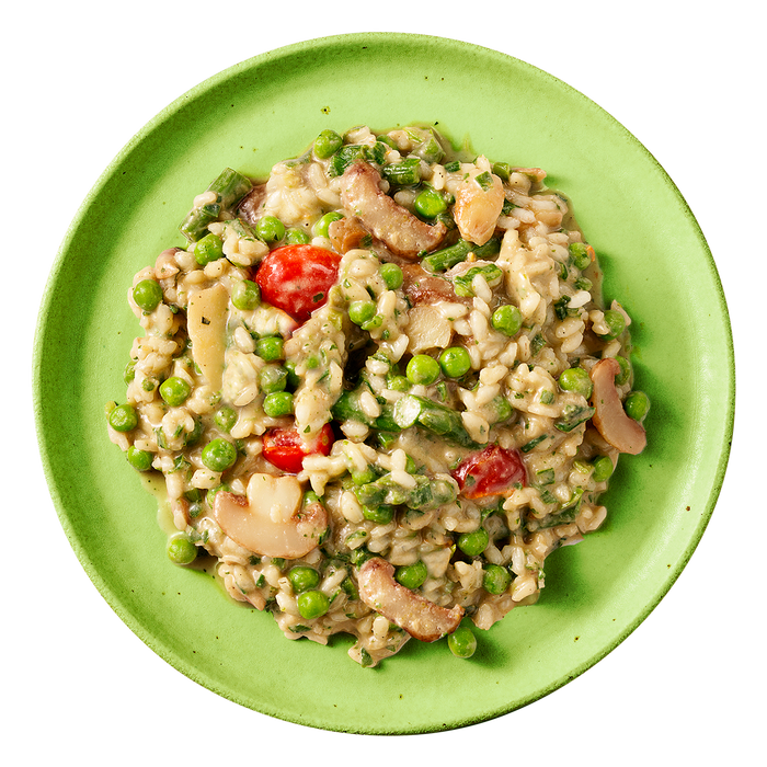 This creamy Italian Risotto meal is loaded with fresh mushrooms and vegetables such as green asparagus, green peas, cherry tomatoes and spring onion. Ready in 8 minutes.